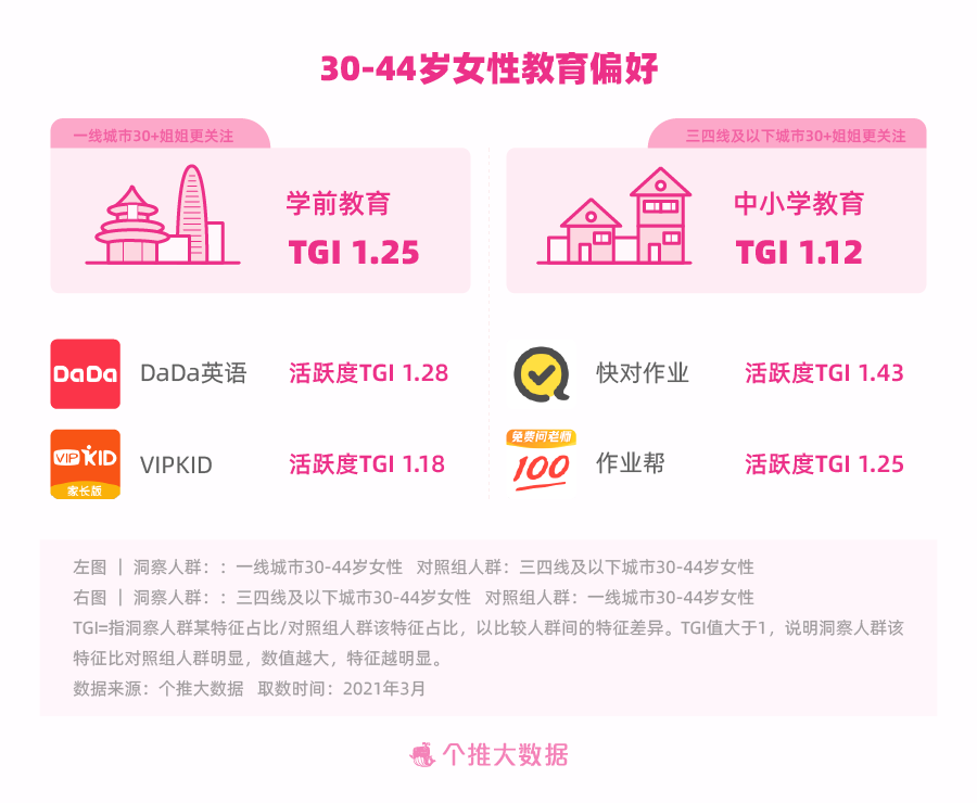 咱们还从更细分的城市维度,对30-40岁年纪段宝妈们的教育现状进行了洞悉。咱们经过数据发现,一线城市30-44岁的宝妈们“学前教育”特点更显着,也更重视培育孩子的英语沟通才能,会频频运用DaDa英语、VIPKID等少儿英语训练类APP;30-44岁的小镇妈妈则是“中小学教育”特征愈加显着,快对作业、作业帮等作业教导类APP的活泼度更高。