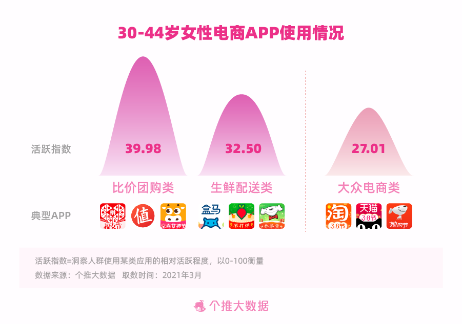 在家庭消费方面,30-44岁女人体现得适当“精明”。一方面,她们考究日子的质量,也寻求服务的功率,对能及时送货到家、主打新鲜特征的生鲜配送类APP尤为热心,“盒马”“叮咚买菜”“京东到家”等APP的活泼度均高于全量女人。一起,她们也很会过日子,拿手克勤克俭,“什么值得买”“拼多多”“京喜”等比价团购类APP的活泼度相对全量女人更高。30+的姐姐们在消费方面理性又抑制,懂得花最少的钱为家里买到最适合、最高性价比的产品。