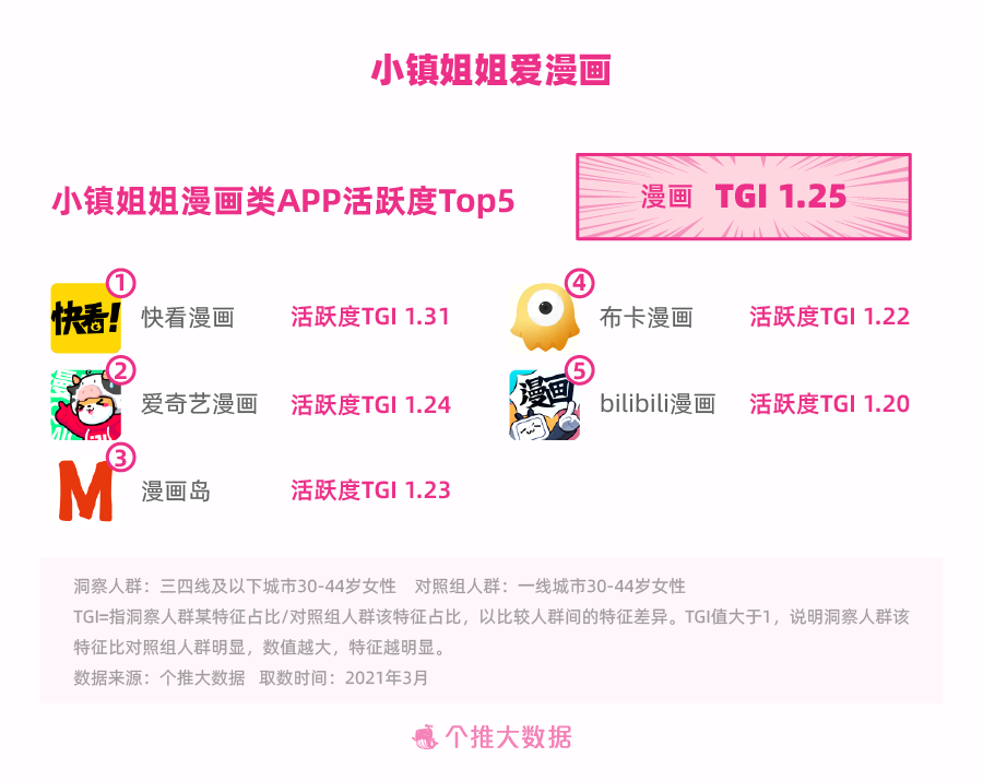 一起,每日互动个推大数据显现,30+姐姐们的QQ阅览、咪咕阅览等阅览类APP的活泼度也比较高。在其他阅览偏好方面,咱们发现,比较更喜爱看“新闻资讯”的一线城市30+姐姐们,小镇姐姐更偏心漫画以及轻松搞笑类的内容。在妈妈、妻子的多重人物背面,小镇姐姐依然怀有一颗粉红色的少女心。快看漫画、爱奇艺漫画、漫画岛、布卡漫画、哔哩哔哩漫画,是她们常常会翻开运用的漫画类APP Top5。