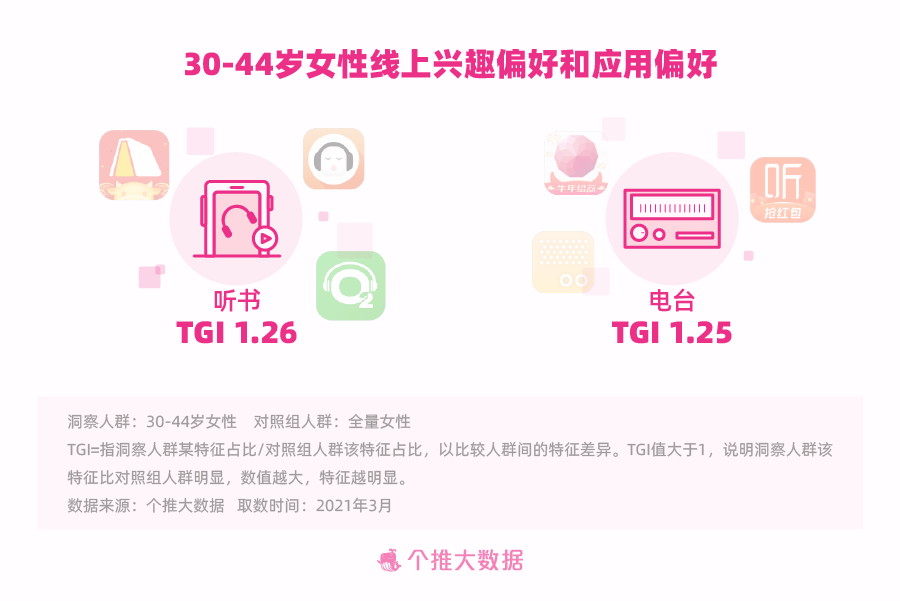 每日互动个推大数据显现,比较全量女人,30-44岁女人更喜爱“电台”这种随同性前言,对“听书”偏好显着。在上下班的路上翻开荔枝FM、樊登读书、喜马拉雅等APP,抓住时间短的空闲韶光追正在更新的广播剧、听一本经典小说或回味一首老歌,她们懂得在日子的柴米油盐和锅碗瓢盆之外,享用真实归于自己的小韶光。