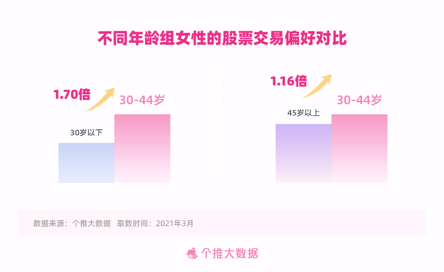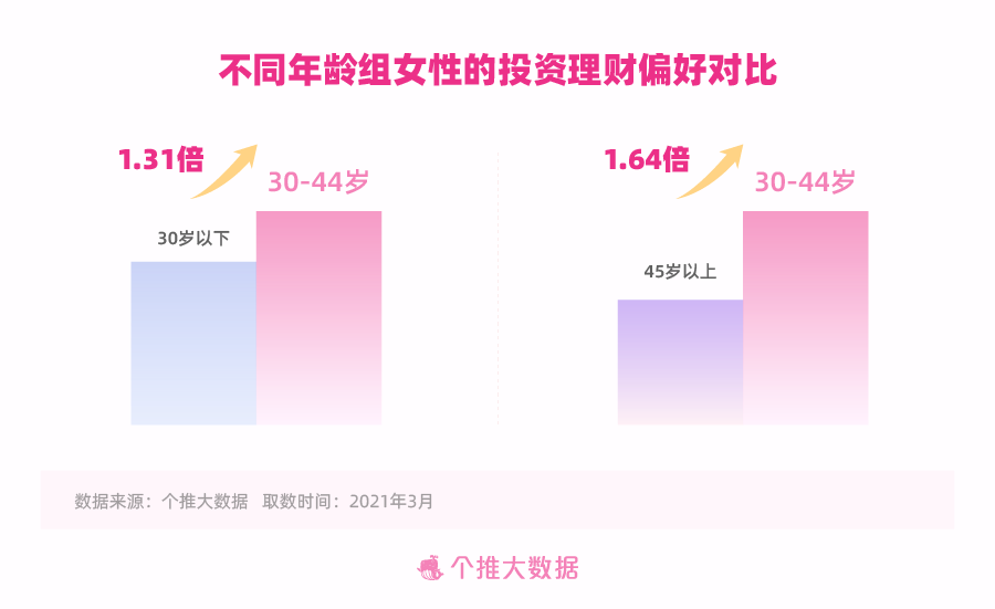 依据每日互动个推大数据洞悉成果,30-44岁女人的出资理财偏比如30岁以下及45岁以上的女人集体都愈加显着。