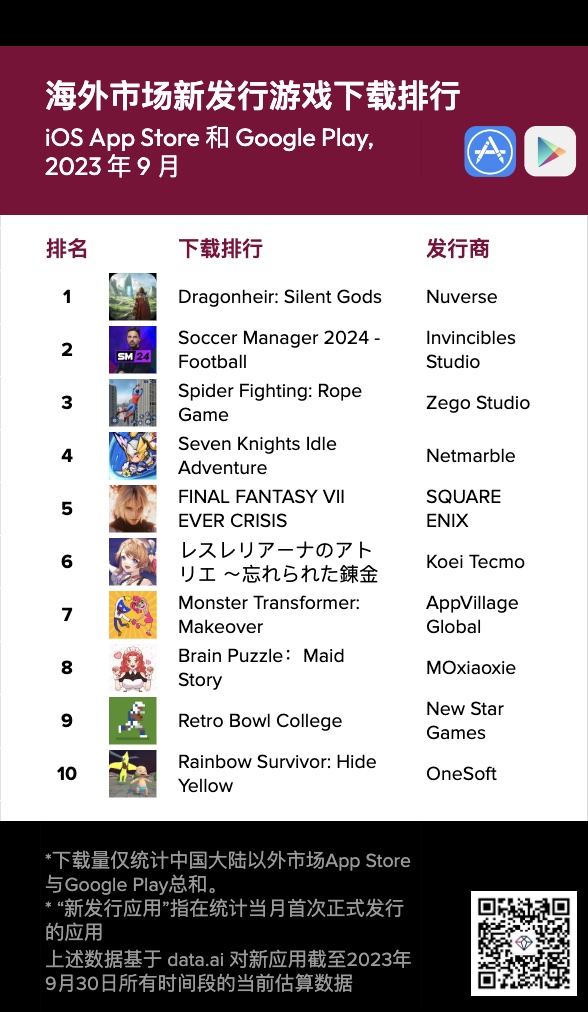 依据 data.ai 发布的 2023 年 9 月海外新使用下载榜,本期共有 16 款新游戏使用,6 款新非游戏使用下载量打破 100 万。榜单榜首名分别是RPG游戏 Dragonheir: Silent Gods,以及VPN加速器 Smart VPN。以下为具体内容: